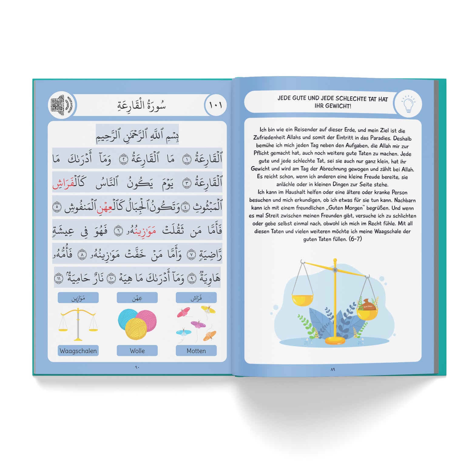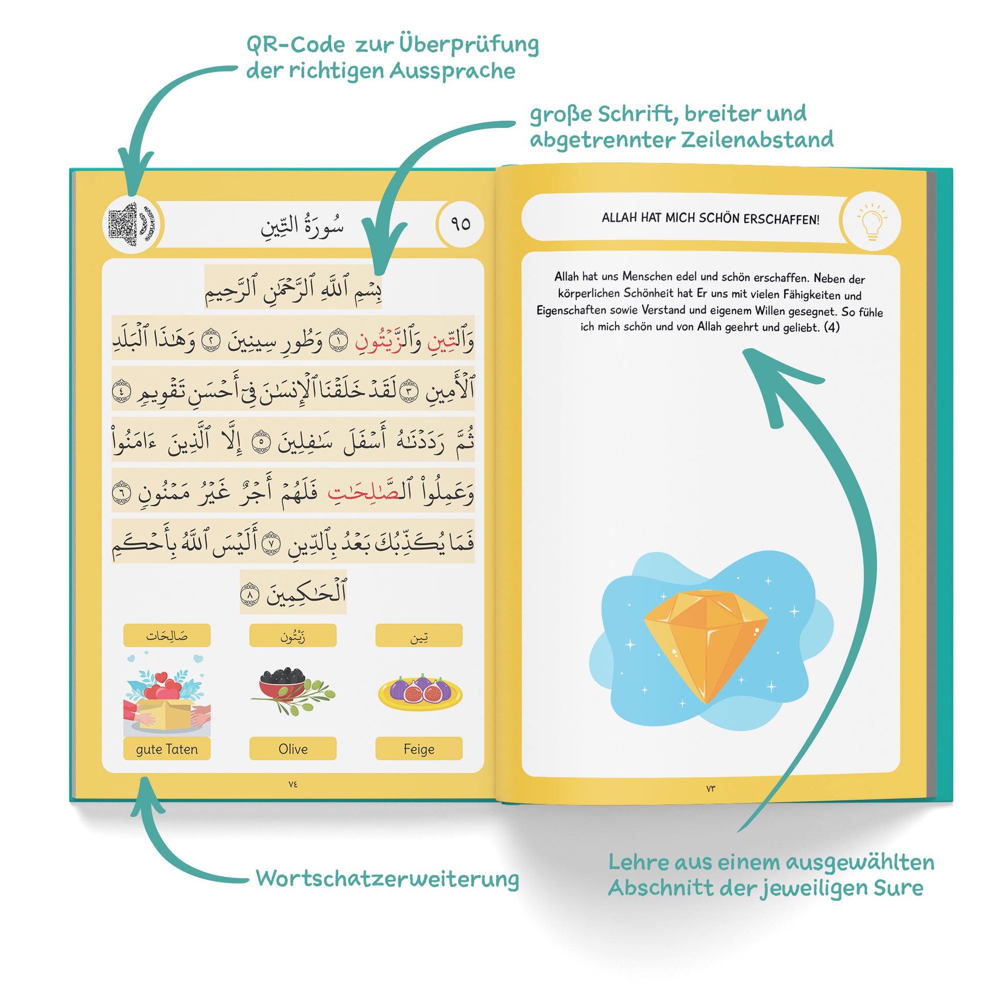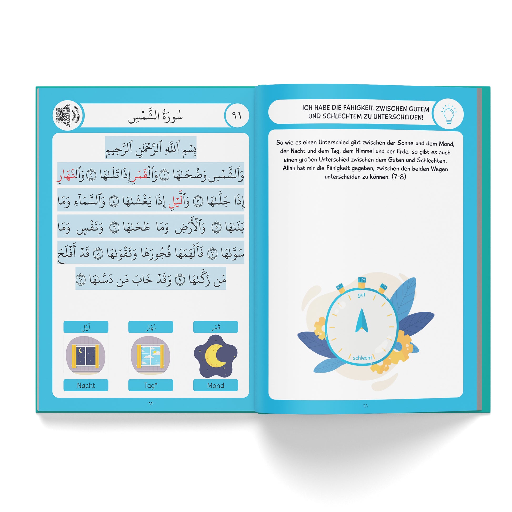 Zur Erweiterung des Wortschatzes sind einige Wörter aus den jeweiligen Suren übersetzt und illustriert – mit dem Ziel, die arabische Sprache sowie auch die emotionale Bindung zum Qur’an zu fördern.