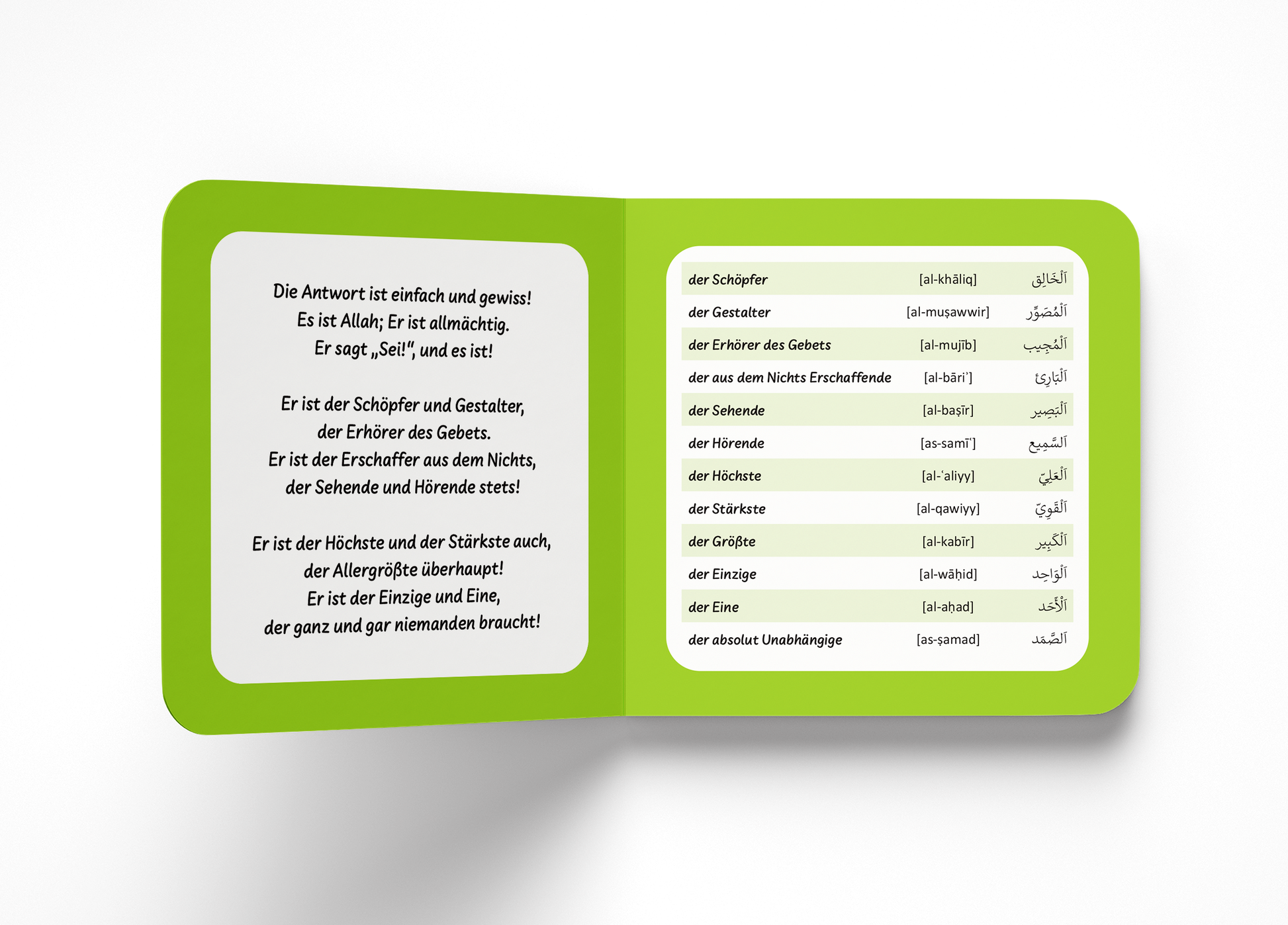 Während die Fragen schon in den Kleinsten ein Bewusstsein für die wunderschöne Schöpfung Allahs wecken, erfahren sie in den Antworten, wer Allah ist, und lernen einige Seiner Namen und Eigenschaften kennen.
