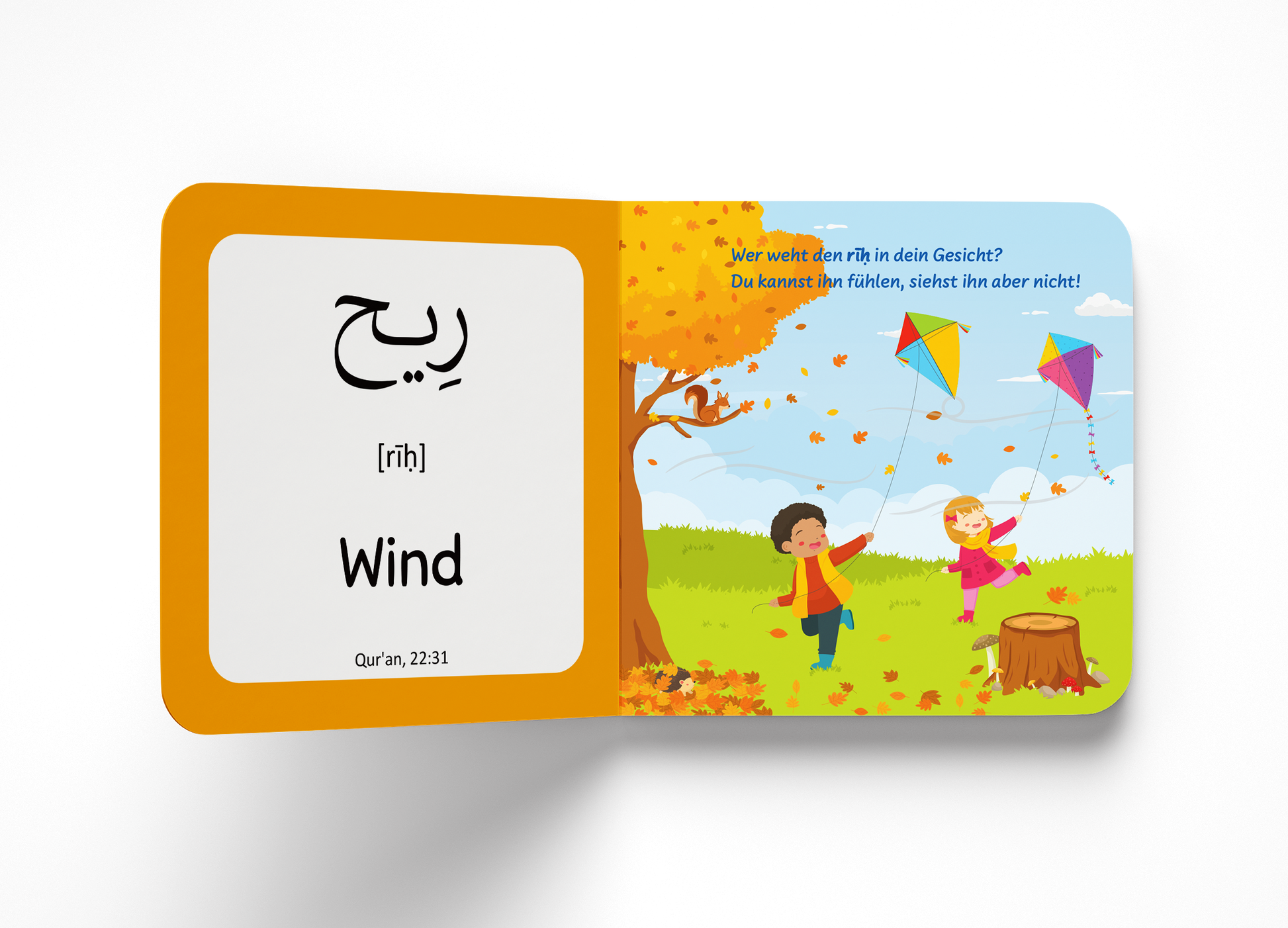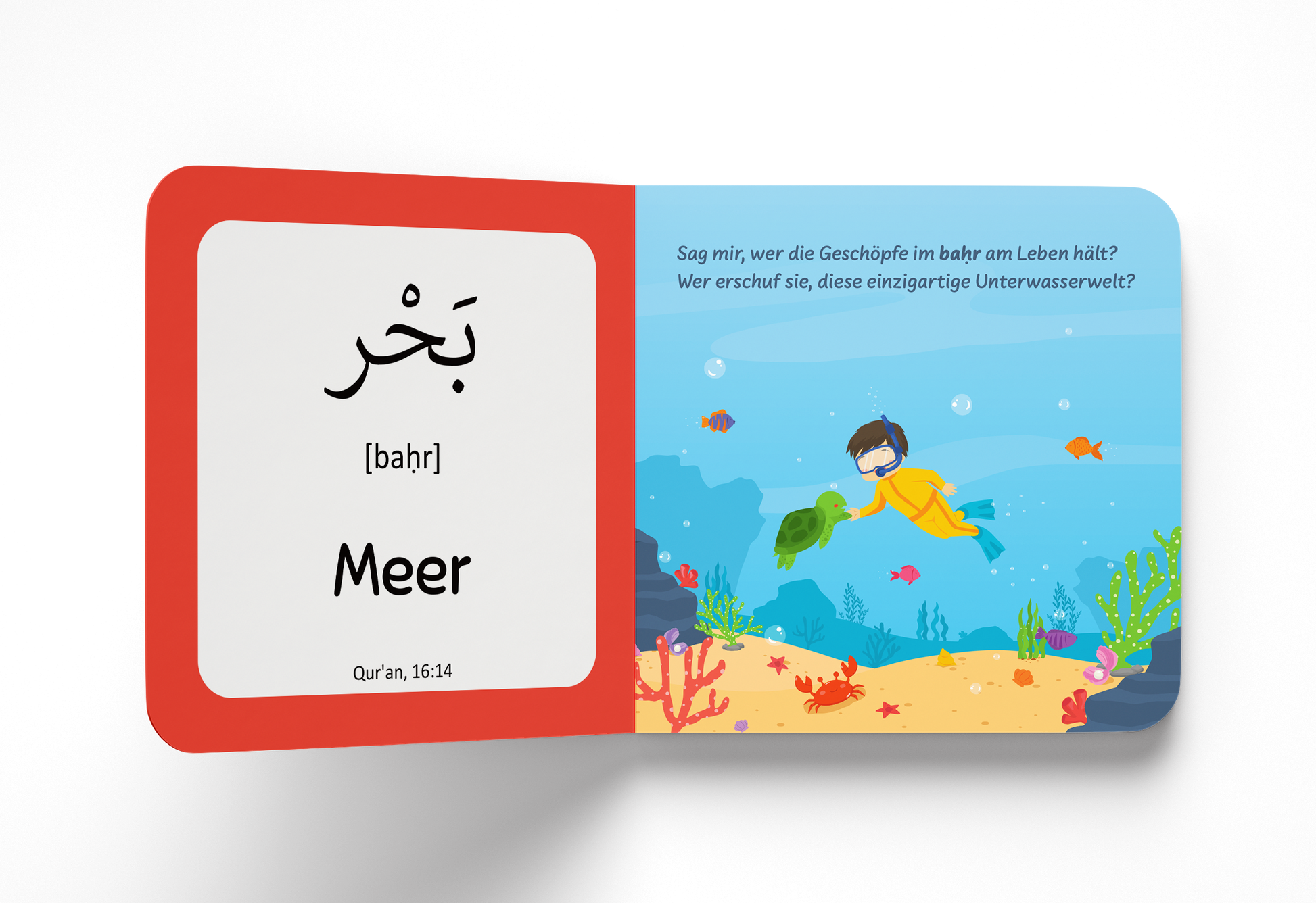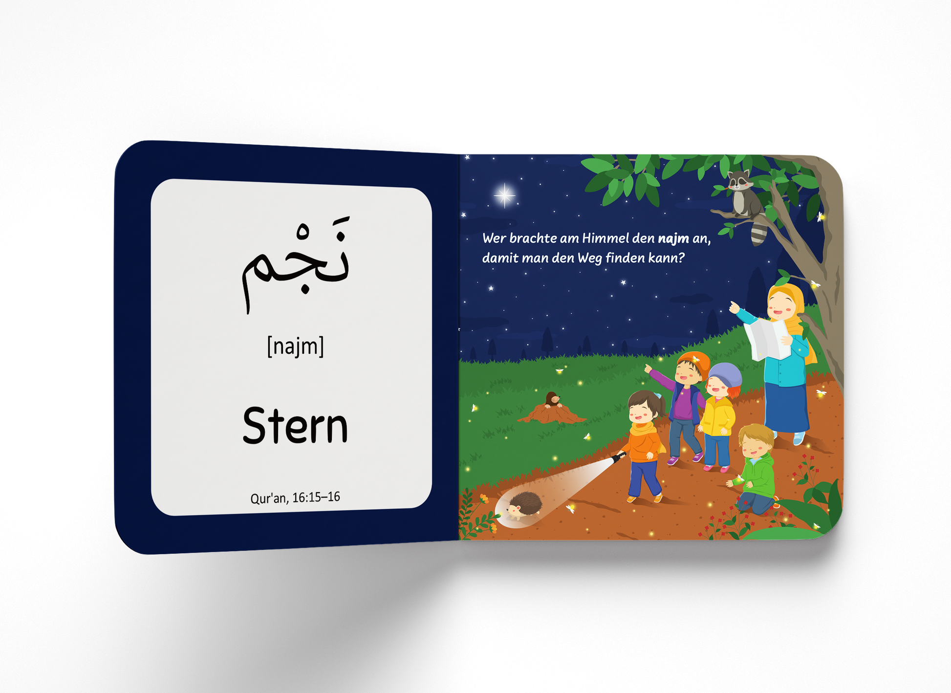 Ein liebevoll illustriertes Buch, mit dem Kinder altersgerecht ihre ersten Wörter aus dem Qur’an erlernen, die auch im kindlichen Alltag eine Rolle spielen. Jeder Begriff wird in arabischer Schrift und in Lautschrift wiedergegeben und zusätzlich in einen Reim eingebettet. Um das Hörverstehen zu entwickeln und zu fördern sowie einen direkten Bezug zum Qur’an herzustellen, ist zu jedem Wort ein Vers angegeben, der vorgelesen oder abgespielt werden kann. Über einen QR-Code gibt es gratis Zugriff auf das Hörspiel zum Buch.