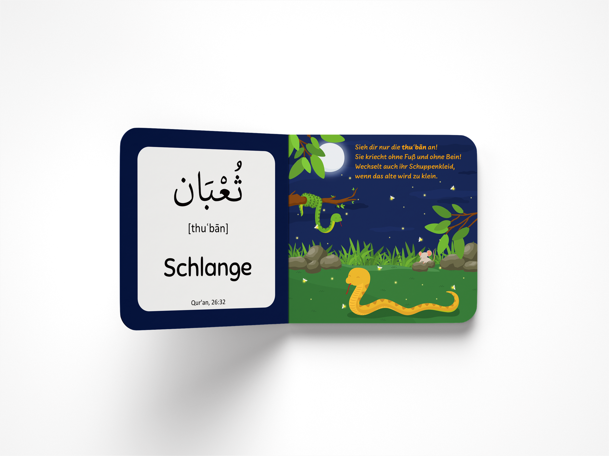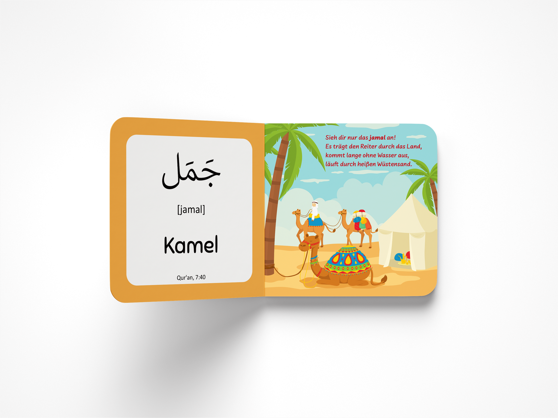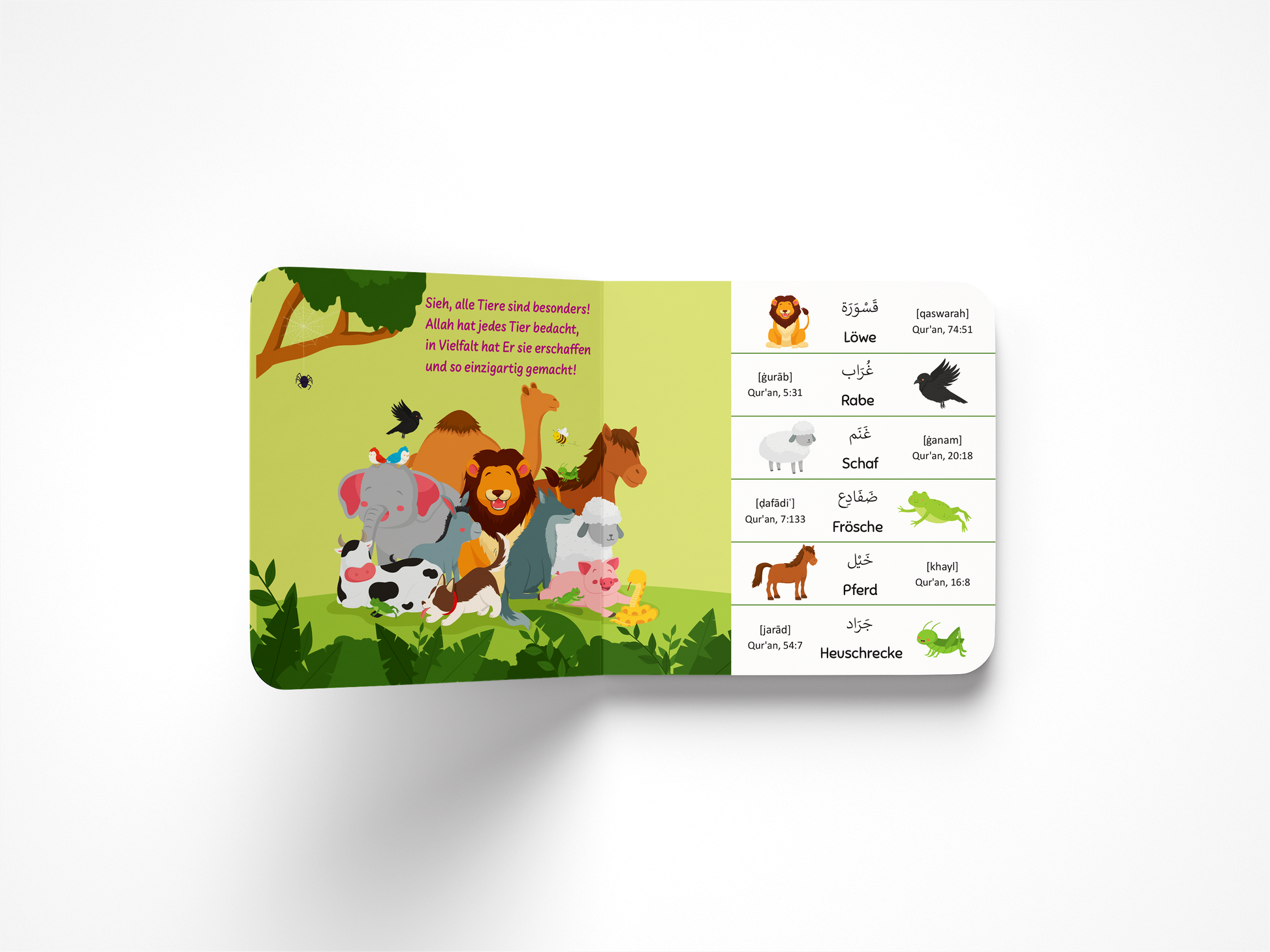 Ein liebevoll illustriertes Buch, mit dem Kinder altersgerecht ihre ersten Wörter aus dem Qur’an erlernen, die auch im kindlichen Alltag eine Rolle spielen. Jeder Begriff wird in arabischer Schrift und in Lautschrift wiedergegeben und zusätzlich in einen Reim eingebettet. Um das Hörverstehen zu entwickeln und zu fördern sowie einen direkten Bezug zum Qur’an herzustellen, ist zu jedem Wort ein Vers angegeben, der vorgelesen oder abgespielt werden kann.