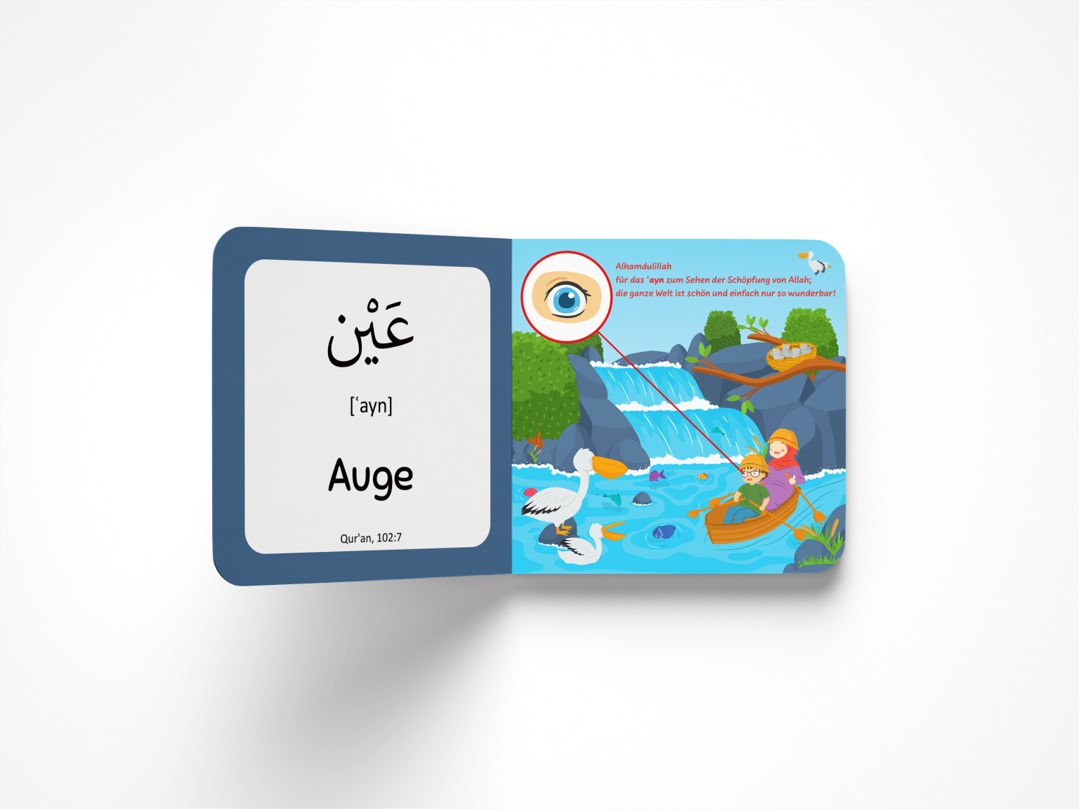 Ein liebevoll illustriertes Buch, mit dem Kinder altersgerecht ihre ersten Wörter aus dem Qur’an erlernen, die auch im kindlichen Alltag eine Rolle spielen. Jeder Begriff wird in arabischer Schrift und in Lautschrift wiedergegeben und zusätzlich in einen Reim eingebettet. Um das Hörverstehen zu entwickeln und zu fördern sowie einen direkten Bezug zum Qur’an herzustellen, ist zu jedem Wort ein Vers angegeben, der vorgelesen oder abgespielt werden kann. Über einen QR-Code gibt es gratis Zugriff auf das Hörspiel zum Buch.